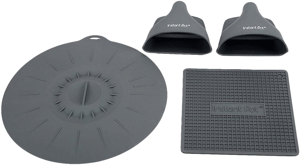 Instant Pot siliconen starterkit heeft alles wat je nodig hebt voor je fornuis. De Mini Mitts zijn ideaal voor het verwijderen van uw binnenpan, een pannenlap kan worden gebruikt als onderzetter om uw binnenpan te plaatsen zodra u klaar bent om te serveren, en een deksel met zuignap, uniek ontworpen om op de 5.7L en 8L fornuizen te passen.