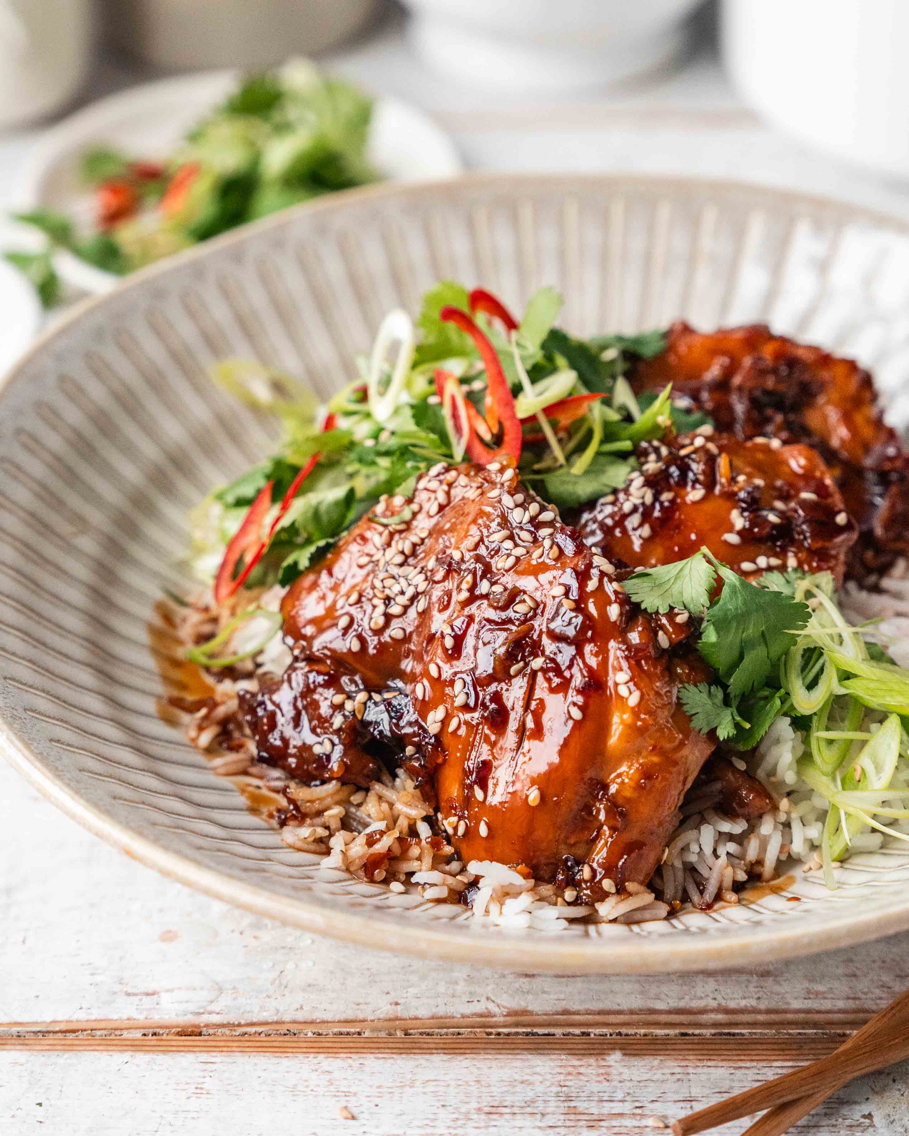 Divide the rice between four bowls. Spoon the sticky honey sesame chicken and sauce over the rice and finish with the fresh herb garnish.