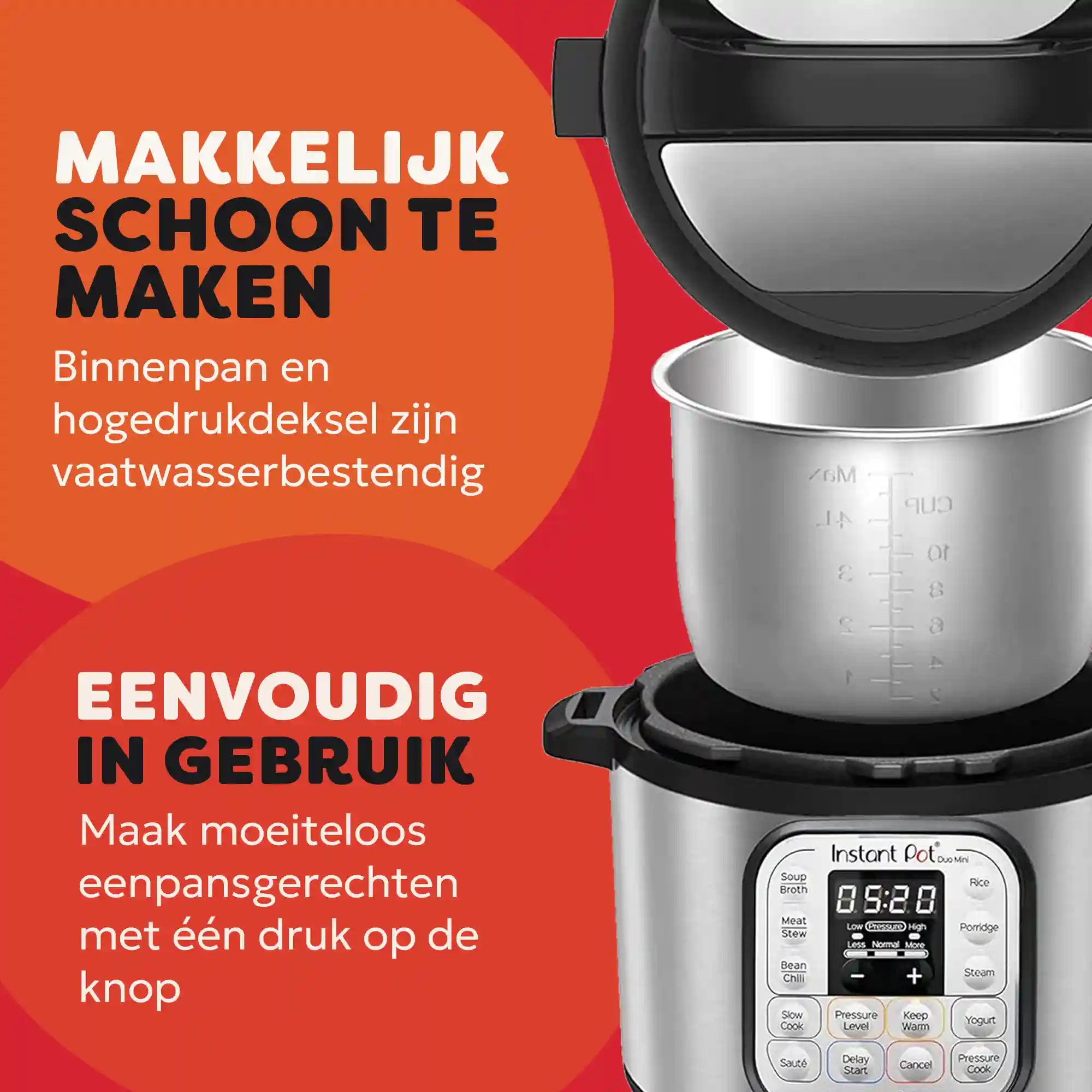 Instant Pot Duo 3L Mini multicooker, roestvrijstalen binnenpan, stoomrek zonder handvatten, handleiding Engels (Nederlands digitaal verkrijgbaar).