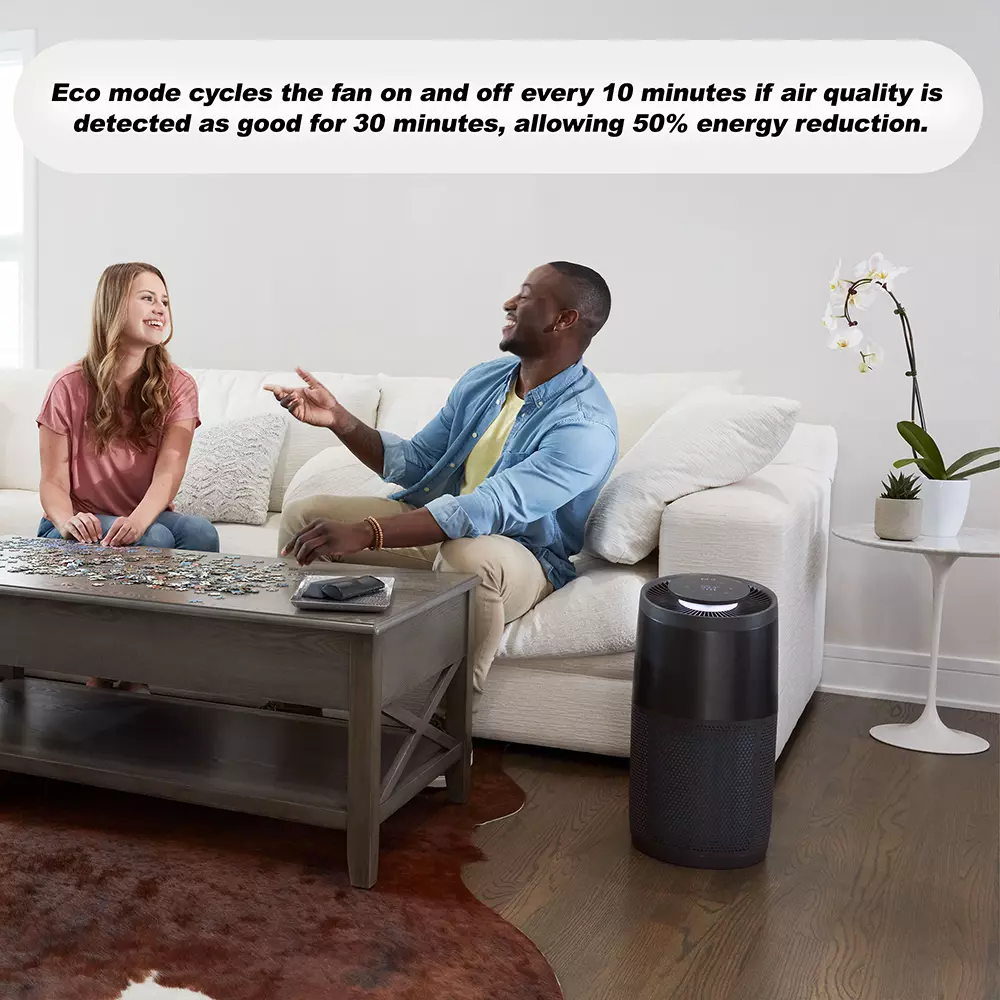 - Eco-modus schakelt de ventilator elke 10 minuten aan en uit, als de luchtkwaliteit gedurende 30 minuten als goed wordt gedetecteerd, waardoor 50% energie wordt bespaard (Energy Star-gecertificeerd)