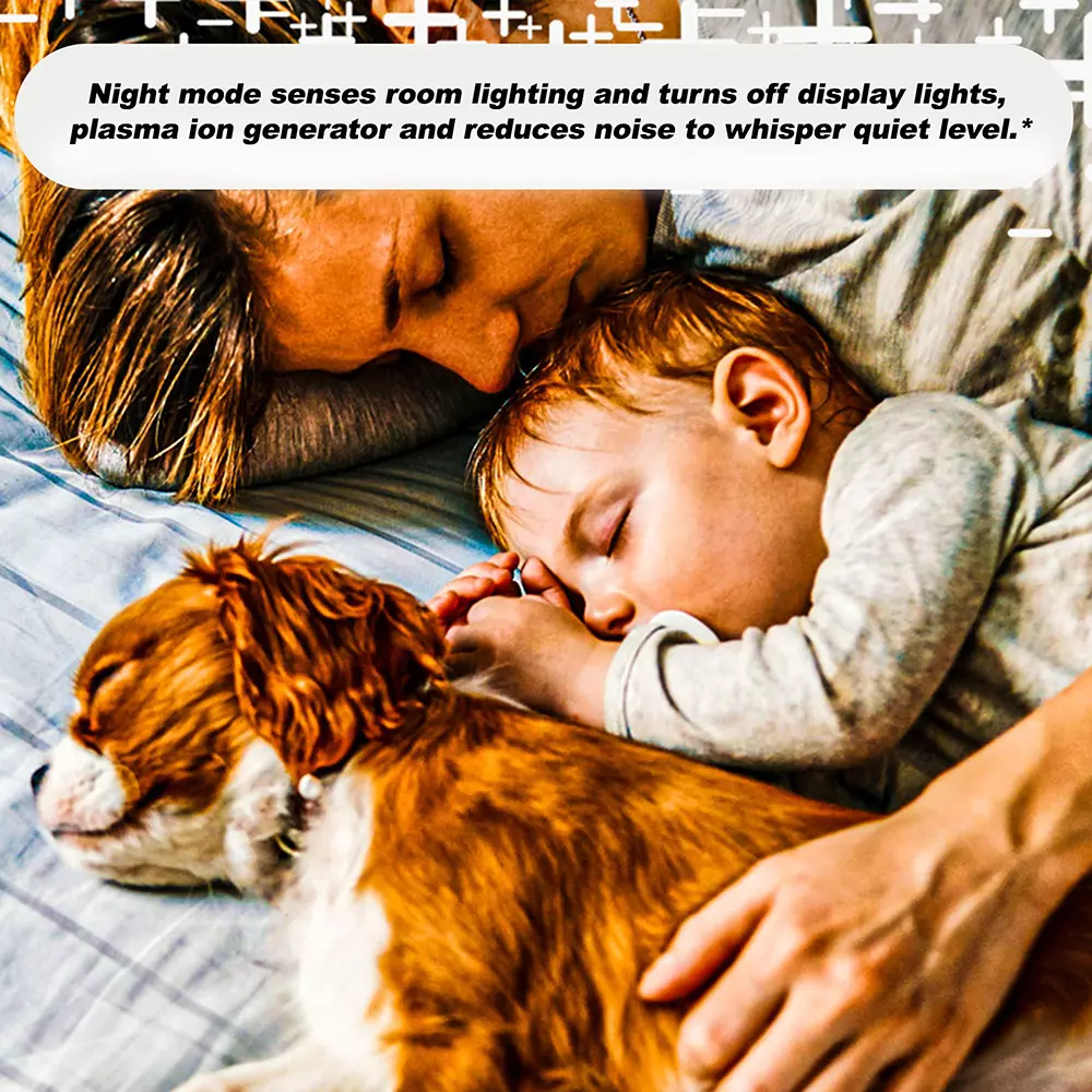 - De nachtmodus detecteert de verlichting in de kamer en schakelt de displayverlichting uit, schakelt de plasma-iongenerator uit en reduceert het geluid tot een fluisterstil niveau (4)