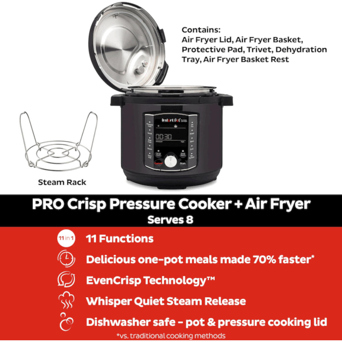 Deze Instant Pot met (los) airfyer deksel van 8 liter heeft een grote capaciteit en kookt tot 70% sneller dan andere kookmethoden, waardoor het perfect is voor gezinnen, wekelijkse/maandelijkse maaltijden en grote batches als je veel monden te voeden hebt. Breng het naar potlucks, feesten, evenementen en meer, en deel je creaties met iedereen!