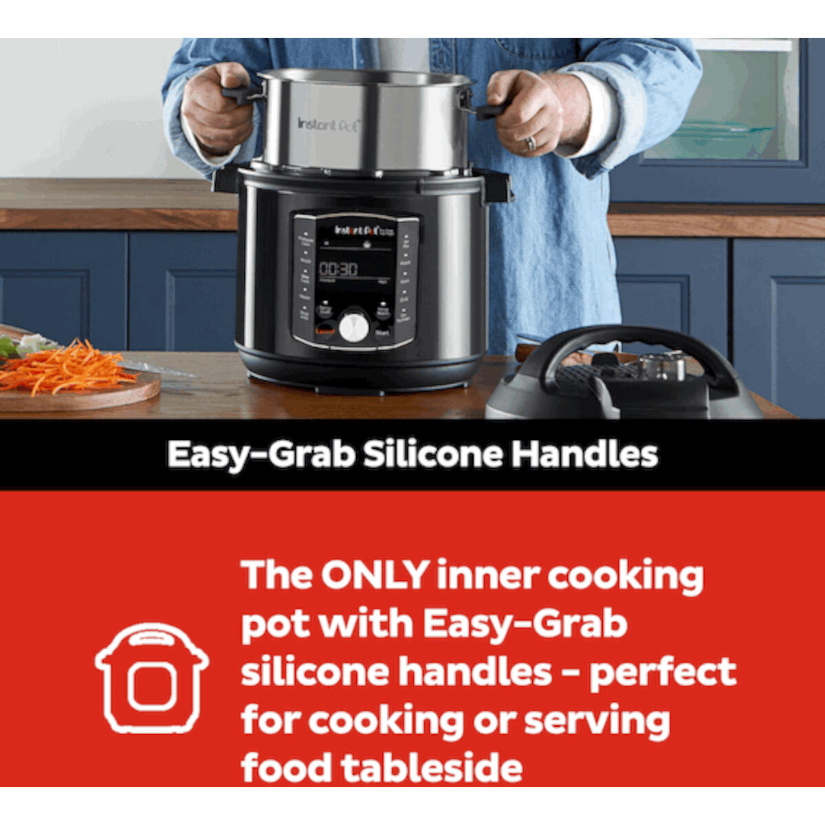 De verbeterde binnenpan is gemaakt van hoogwaardig 304 roestvrij staal (18/8) en heeft siliconen handgrepen voor gemakkelijk vastgrijpen, evenals een platte, drielaagse bodem voor het ultieme schroeien en sauteren. Kook in je Instant Pot, of breng de binnenpan over op een elektrische, keramische, gas- of inductiekookplaat, of in een oven die is ingesteld op 230°C, en stop hem dan in de vaatwasser voor een snelle reiniging.