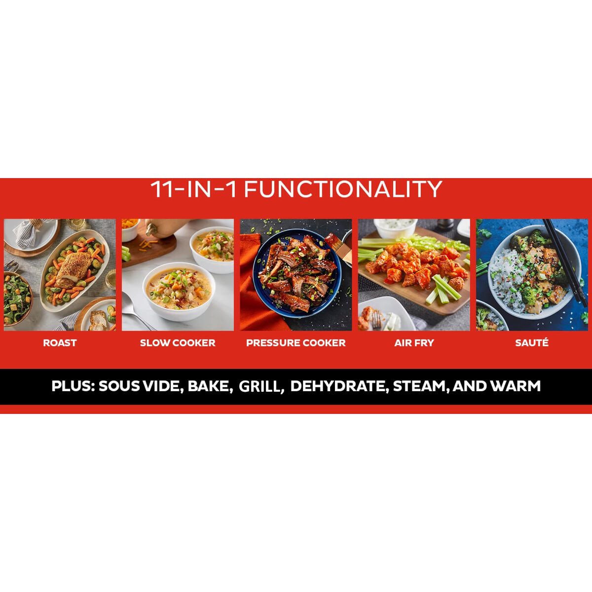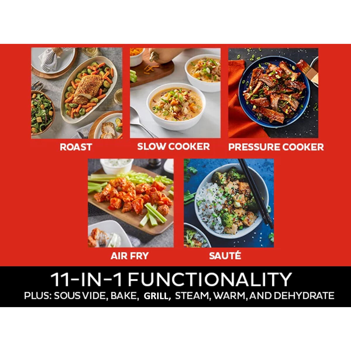 Met een aanpasbaar temperatuurbereik van 21°C tot 232°C, kunt u alles doen, van drogen op lage temperatuur tot grillen op hoge temperatuur, allemaal in dezelfde multicooker.