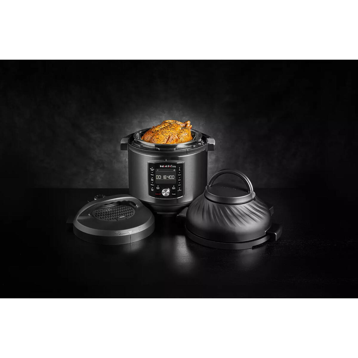 De Pro Crisp™ + Air Fryer wordt geleverd met 2 afneembare deksels, waardoor je toegang hebt tot een hele wereld aan kookstijlen. Kook de kip onder hoge druk, verwissel de deksels en krokant de schil tot gouden perfectie, of gebruik uitsluitend het deksel van de airfryer - perfect voor bevroren snacks, cakes en meer.