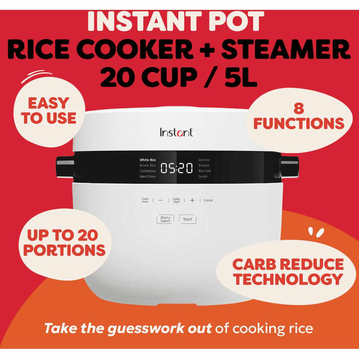 - 8-in-1 programma's: Witte rijst, bruine rijst, koolhydraatvermindering, gemengde granen, quinoa, stomen, slowcooken, sauteren