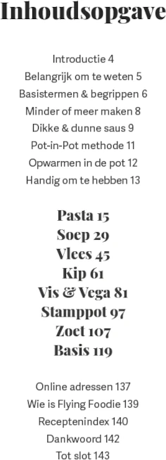 Je vindt een breed scala aan recepten in dit boek, van pasta, soep, stamppot en vlees tot kip, vis en vegetarische gerechten. En natuurlijk ontbreken zoete recepten niet! De meeste recepten zijn nieuw en niet eerder online verschenen op onze website. Enkele klassiekers zoals kippensoep, Bolognesesaus en zuurkool zijn echter ook opgenomen.